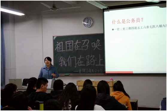 讲座开始前,主持人阐明了本次讲座的主题,介绍了苗娜老师的身份、学历以及讲座经验。随后苗娜老师上台讲解了什么是公务员、怎样报考公务员、如何考上公务员,对于现在处于毕业迷茫期的学生很有效果。她还对2016年国家公务员招录考试考情考务和大纲进行解读,对国家公务员考试的具体情况以及考试中的重难点进行分析,使同学们对公务员考试有了更深一步的认识。最精彩的部分是苗娜老师与现场同学一起进行了真题演练,在互动中让学生自主思考,转换思维。在讲座的最后,进行了抽奖环节,幸运的同学得到了送出的精美小礼品。